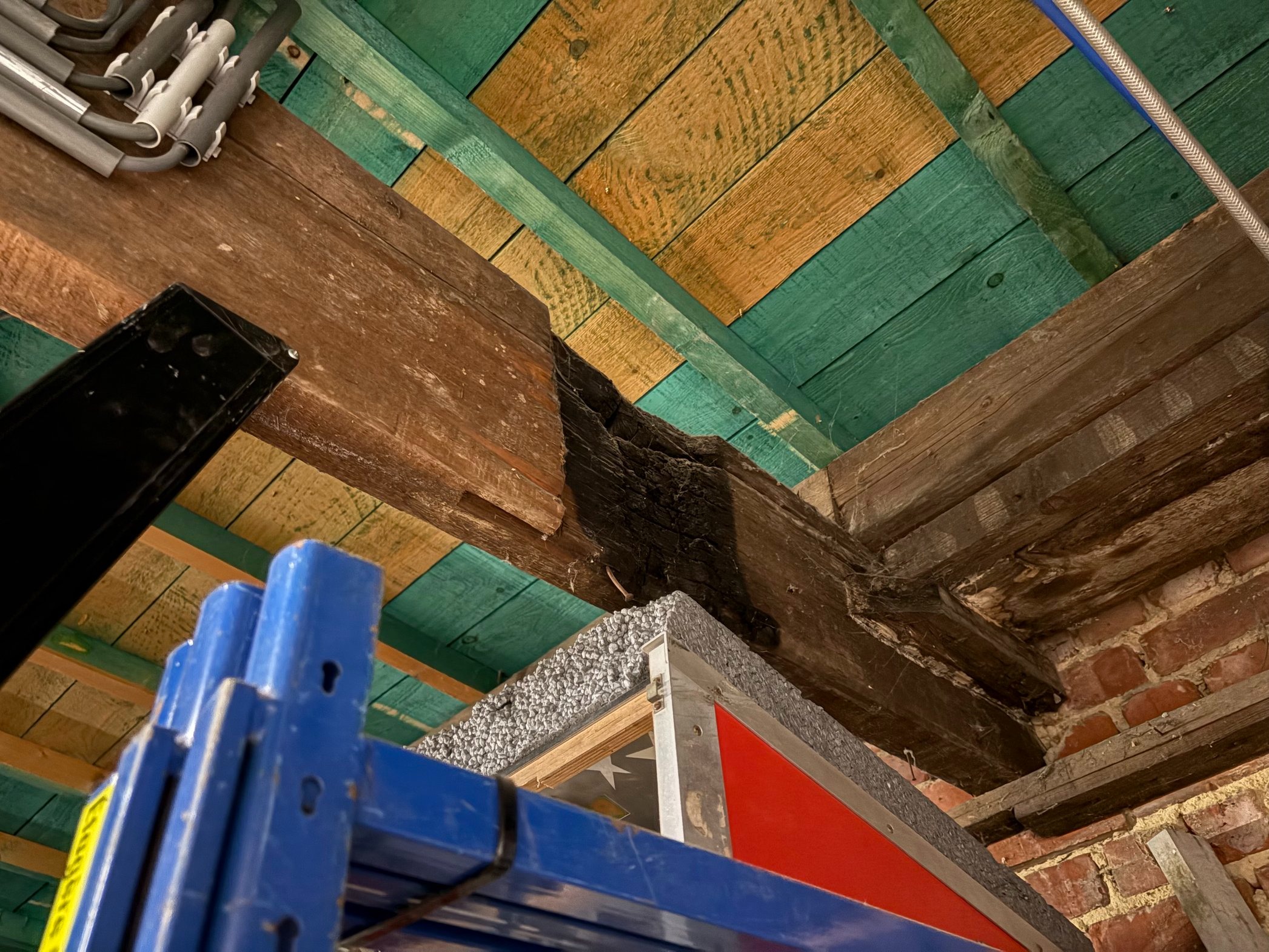 Une poutre a été brûlée vraisemblablement par la cheminée d'un poêle mal installé par un précédent usager du lieu.